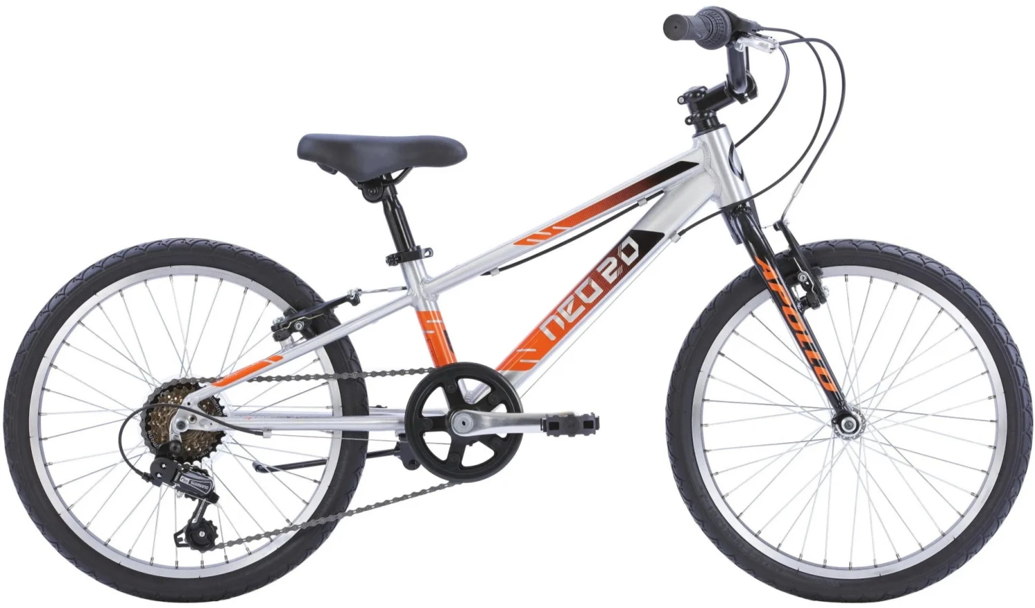 Apollo’s Neo 20 is a lightweight, comfortable and efficient kid’s mountain bike with 20” wheels. Designed around a lightweight Junior specific alloy frame with oversized thin-wall alloy tubes. The lightweight alloy straight blade fork minimizes weight while maximizing pedaling efficiency. Light weight alloy hubs, rims, handlebars and stem, all work to reduce the overall weight of the bicycle, making it one of the lightest 20” Kids Bikes around. A low stand over height allows easy and confident operation while the super comfortable junior specific saddle and grips provide lasting riding comfort. A Lightweight alloy crank set with child specific easy pedaling gearing keeps things moving while the Shimano 6-speed Revo twist-shifter and full alloy child specific short reach brake levers provide easy operation, reliable shifting performance and complete brake control for young riders.