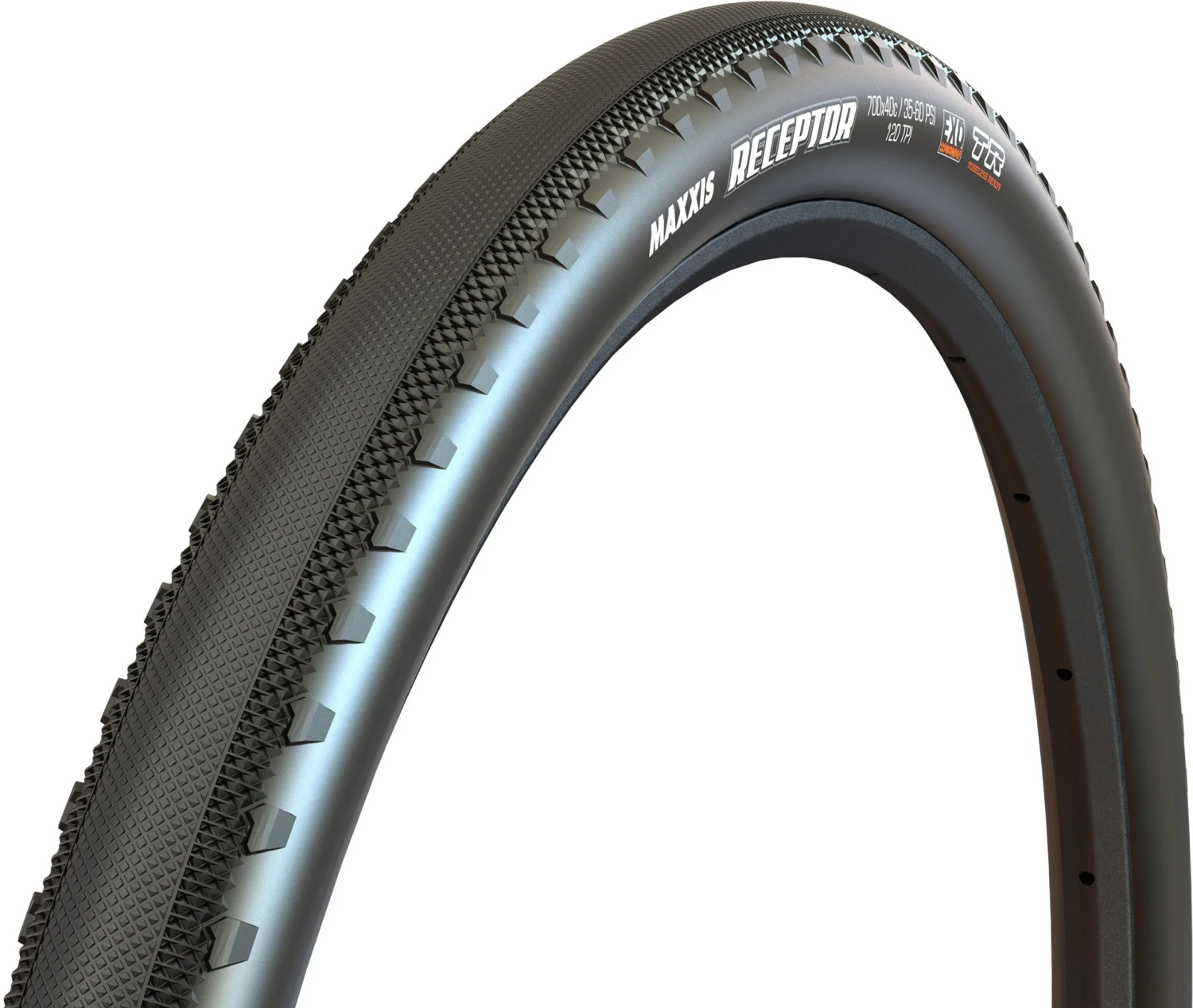 The Maxxis Receptor is a semi-slick gravel tire designed for riding on pavement, hard-packed dirt roads, and light gravel. With its low profile center tread, the Receptor rolls easily no matter the surface. Small side knobs provide cornering traction in loose over hard terrain.