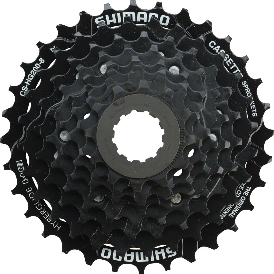 Shimano CS-HG200 7/8/9-Speed cassettes feature Hyperglide technology for reliable shifting performance and zinc phosphate coated steel gears for added corrosion resistance.